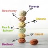 Composition: Wheat, Maize, Dried Beetroot powder (2.6%), Chickpea Flour, Dried Turmeric powder (1%), Dried Carrot powder (0.5%), Dried Banana powder (0.3%), Dried Parsnip powder (0.3%) Calcium carbonate, Blackcurrants, Rosemary, Pomegranate, Vegetable powder, Soya Oil.